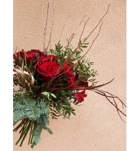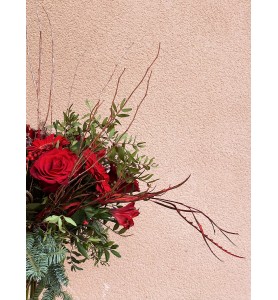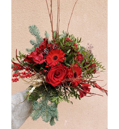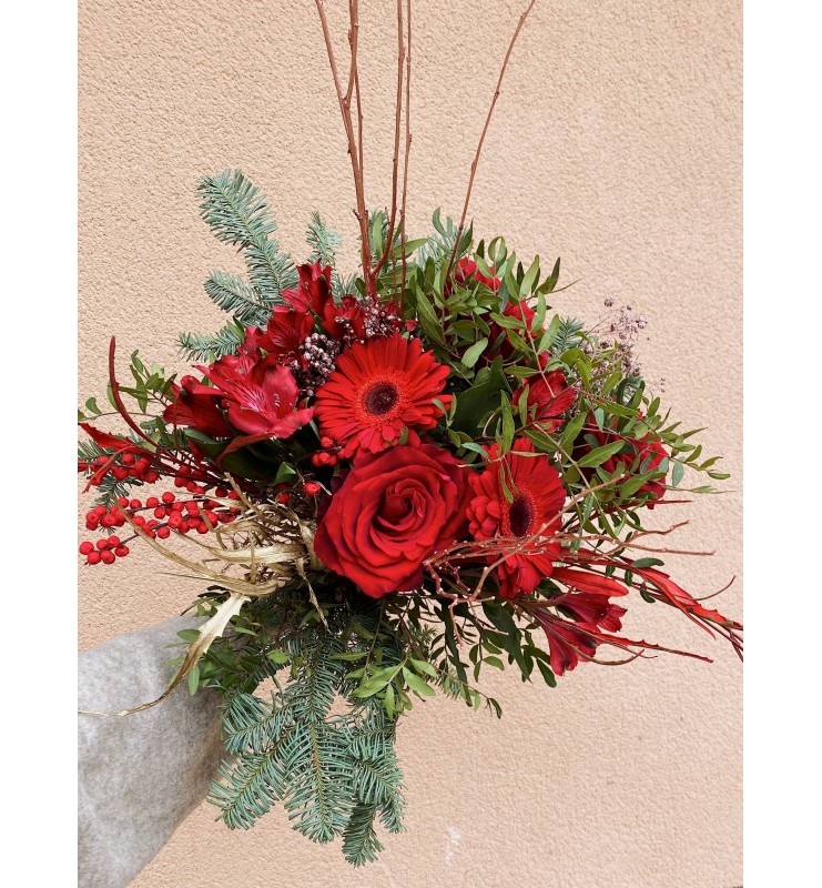Ramo de flores en tonos rojos con verdes variados de ésta época y detalles navideños.