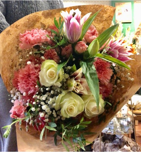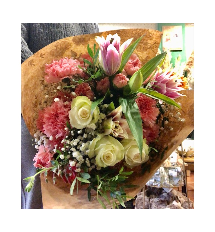 ramo confeccionado con flor fresca disponible de cada día y según temporada, donde predominan los tonos rosas, blancos, verdes... y al menos 3 tipos distintos de flor.