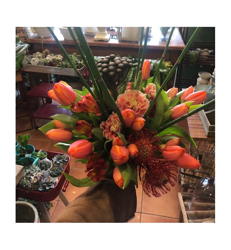 Ramo de flor natural según disponibilidad del día y la temporada, en tonos anaranjados