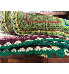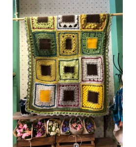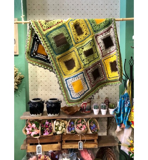 manta de ganchillo tejida a mano con lana de oveja merina y cuadros de tejido de estameña tambien de lana ,modelo único.