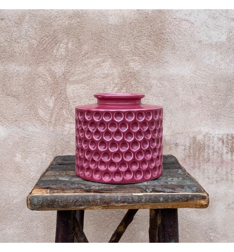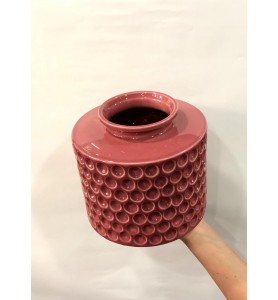 jarrón cilíndrico con hendiduras circulares en color rosado.