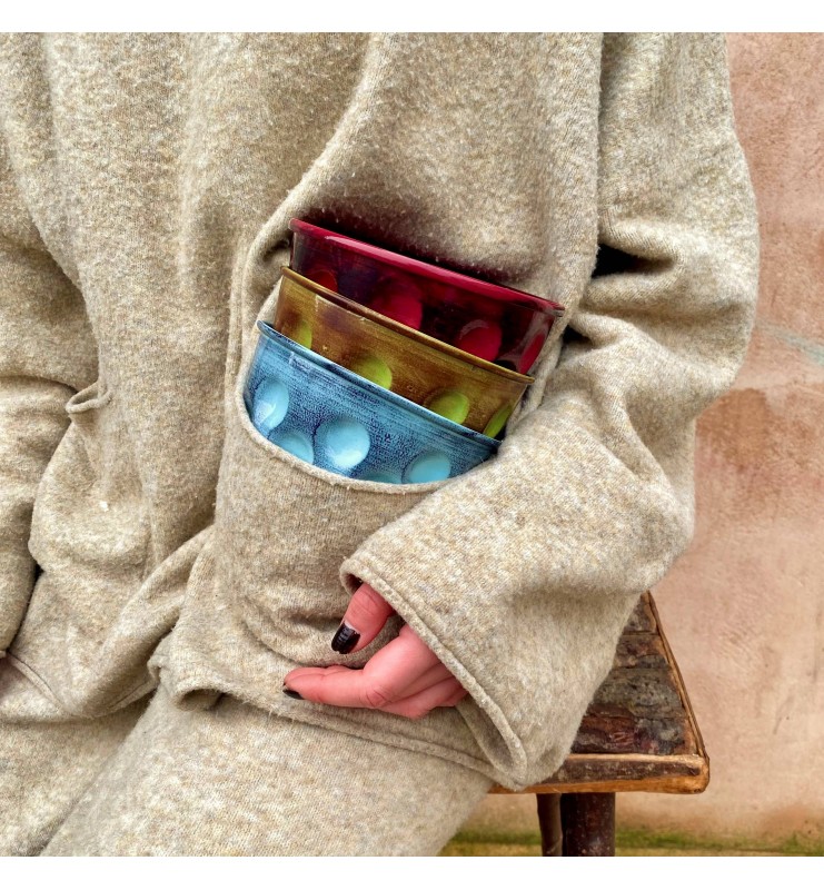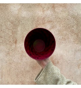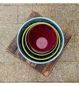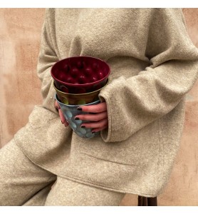 macetero metálico con hendiduras en forma de circulo, disponible en color verde.