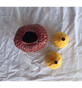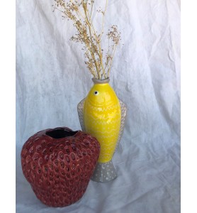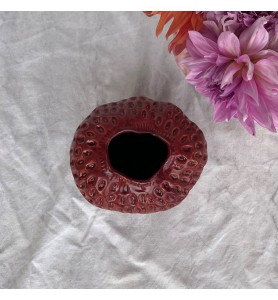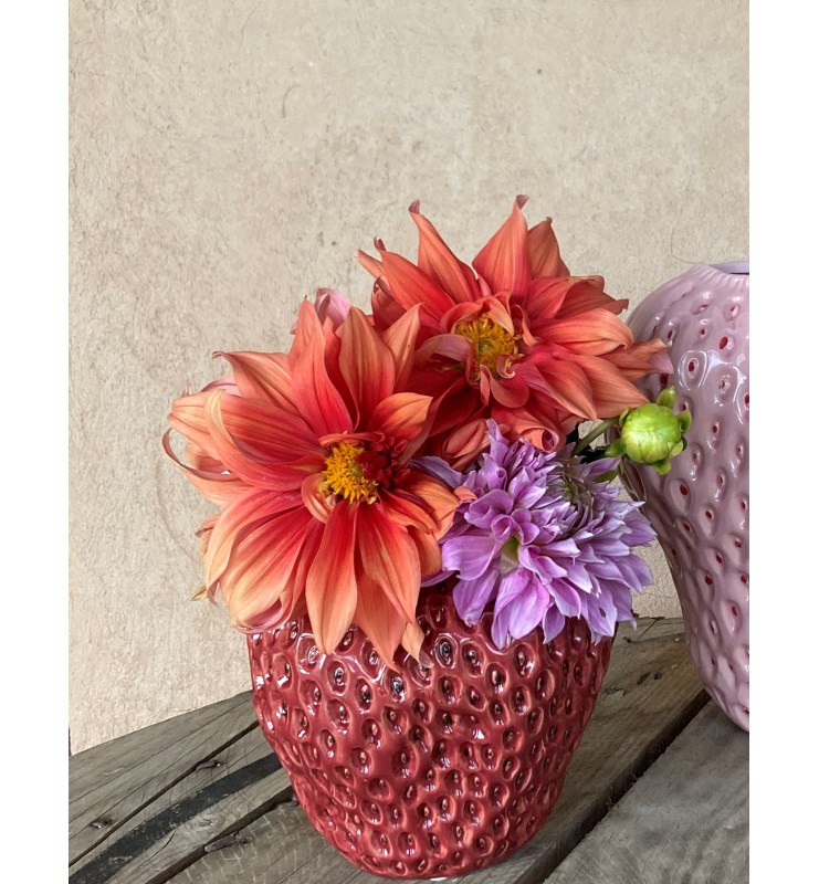jarrón de cerámica color fresa con altura de 16cm. y ancho 16cm. y una boca de 6cm. de diámetro .